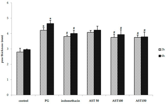 Effect of astaxanthin (AST) on carrageenan-induced paw edema (mm). Data are presented as mean ± SD. * vs. naïve control, p < 0.05 with respect to identical time; # vs. vehicle control (propylene glycol or PG), p < 0.05 with respect to identical time; n = 8 mice/group.