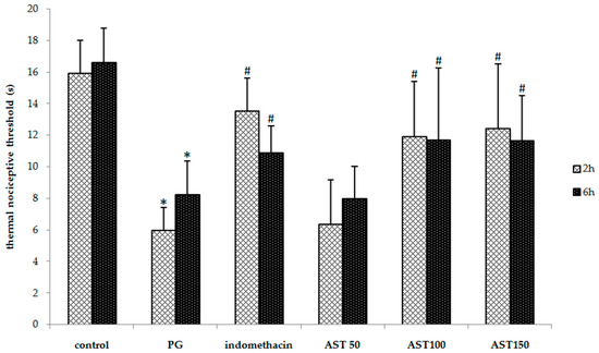 Effect of astaxanthin (AST) on carrageenan-induced thermal hyperalgesia. Data are presented as mean ± SD. * vs. naïve control, p < 0.05 with respect to identical time; # vs. vehicle control (propylene glycol or PG), p < 0.05 with respect to identical time; n = 8 mice/group.