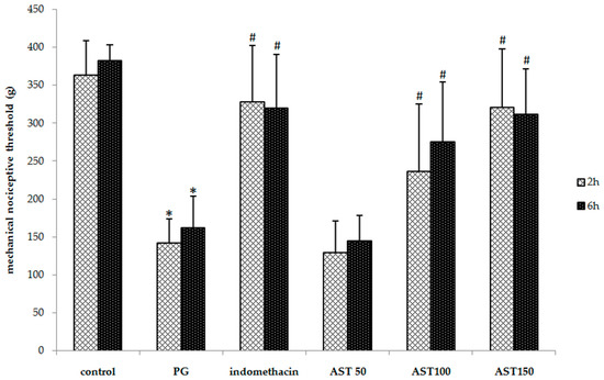 Effect of astaxanthin (AST) on carrageenan-induced mechanical hyperalgesia. Data are presented as mean ± SD. * vs. naïve control, p < 0.05 with respect to identical time; # vs. vehicle control (propylene glycol or PG), p < 0.05 with respect to identical time; n = 8 mice/group.