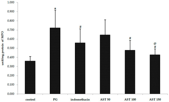 Effect of astaxanthin (AST) on carrageenan-induced MPO accumulation. Data are presented as mean ± SD. * vs. naïve control, p < 0.05; # vs. vehicle control (propylene glycol or PG), p < 0.05; @ vs. indomethacin, p < 0.05; n = 8 mice/group.