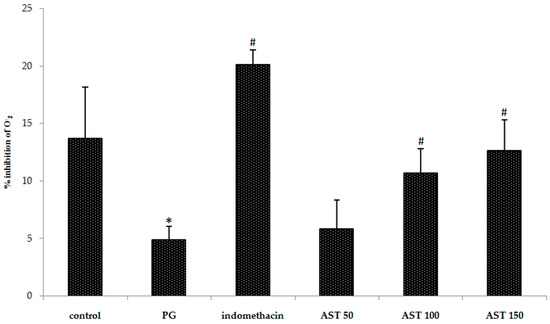 Effect of astaxanthin (AST) on carrageenan-induced ROS release. Data are presented as mean ± SD. * vs. naïve control, p < 0.05; # vs. vehicle control (propylene glycol or PG); n = 8 mice/group.