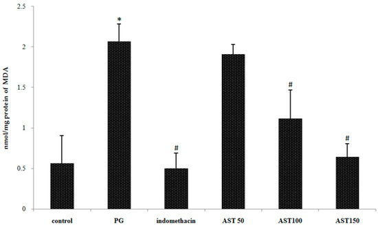 Effect of astaxanthin (AST) on carrageenan-induced lipid peroxidation product or MDA. Data are presented as mean ± SD. * vs. naïve control, p < 0.05; # vs. vehicle control (propylene glycol or PG); n = 5 mice/group.