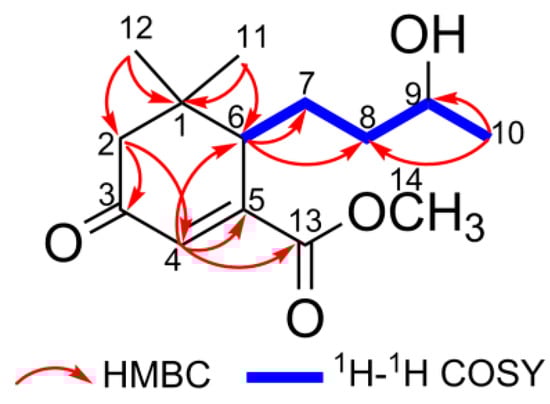 Combining with the signals of HSQC, iterative analyses of HMBC and 1H-1H COSY experiments could elucidate the planar constitution of 1. HMBC correlations from Me-12 and Me-13 to C-1, C-2, and C-6, from H-2 to C-3 and C-4, and from H-4 to C-5 and C-6 indicated the presence of a 5,5-dimethyl-cyclohex-3-one entity. Meanwhile, the HMBC cross peak of H-4 to the ester carbonyl C-13 implied that the ester carbonyl function was located at C-5. Moreover, HMBC correlations from Me-10 to C-8 and C-9, and from H-6 to C-7 and C-8, as well as the 1H-1H COSY spin systems of H-6/H-7/H-8/H-9/H-10 revealed that a 3-hydroxybutyl functionality was connected to the 3,3-dimethyl-cyclohexanone at C-6 (Figure 2). No diagnostic NOESY could be applied to determine the relative configurations of C-6 and C-9, since both carbons were located on a rotational aliphatic chain. Thus, the aforementioned spectral analyses allowed us to assign compound 1 as a member of megastigmane sesquiterpenoid.