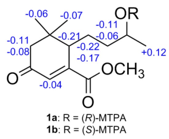 ∆δ values (in ppm) = δS-MTPA-ester − δR-MTPA-ester for 1a and 1b.