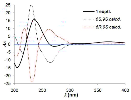 In order to determine the absolute configuration of compound 1, a modified Mosher’s method was carried out to establish the stereochemistry characteristic of secondary alcohol carbon C-9. (S)- and (R)-MTPA esters of 1 were prepared as previously reported [12,13], then analyzed via 1H-NMR chemical shifts study. The distinguishable values (∆δ = δS-MTPA-ester − δR-MTPA-ester) were calculated for proton chemical shifts adjacent to C-9, as shown in Figure 3. Correspondingly, the absolute configuration at C-9 was confirmed to be S. Furthermore, a time-dependent density functional theory (TD-DFT) method on ECD calculation was performed to determine the absolute configuration of the other chiral carbon, viz., C-6. Based on the ascertained absolute configuration of C-9, the calculated ECD curve of (6S,9S)-1 showed a good consistency with the experimental ECD curve (Figure 4), which unequivocally established the absolute configuration of 1 as 6S,9S.