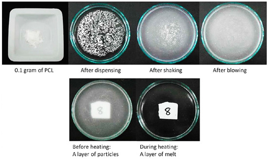 The CAPA® PCL powder was sieved with a no. 140 sieve to confirm its 100 µm powder size. For 500 µm powders, the particle size can be confirmed by sieving with a no. 35 sieve as shown in the ×200 magnification SEM image in Figure 7a,b. As shown in Figure 7c, to facilitate the preparation of a layer of micro-particles, a liquid substrate was used as a platform for the powder and to allow an even distribution of powder particles as reported in our previous studies [38,39]. Briefly, 30 mL of deionized water was prepared and poured into a round glass dish (diameter: 10 cm) at room temperature. 100 µm PCL powder (0.1 g) and 500 µm PCL powder (0.7 g) was weighed and slowly dispensed onto the water surface to form a surface suspension system. The glass dish was then gently shaken circularly to allow the microparticles to distribute evenly on the water surface. A rubber bulb was used to gently blow off and spread the excess powder.