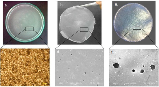 The concept that a layer of micro-particles can be directly formed into a layer of membrane is demonstrated in Figure 1 and Figure 7. Both figures indicate that the membrane can be formed by the powder melting on top of water surface with the use of heat. In this method, water acts as a heat medium and as a platform for PCL particles in both the solid and liquid state. Water allows the particles to stay on top by the effect of surface tension between the hydrophobic polymer and water. Figure 2a shows a layer of dispensed particles spread on the water surface in the form of a surface suspension mixture. Figure 2c is a zoomed-in view that shows a microscopic observation of a layer of particles resting only on the water surface. The fabricated PCL membrane can be found in Figure 2b. It was semi-transparent and soft, and had a similar size as the glass dish. The zoom-in view shows the membrane is solid and micro-porous, as indicated by the microscopic view in Figure 2d.