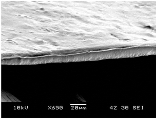The membrane morphology in Figure 2 showed a comparison between the powder layer and the membrane layer. The initial powder layer consists of irregularly shaped particles and the membrane is a solid piece with pores. As the result of the membrane thickness presented in Table 2, the thickness value is much smaller than the size of the PCL particles used. Initially, particles should form a layer of a thickness of about 100 µm and 500 µm as well as a network of spaces among these particles due to their irregular shapes. When particles are melted on the water surface, they become round and spread, and fill in their adjacent spaces. The overall thickness of the layer is reduced as a result of powder redistribution. Moreover, Table 2 also shows that a bigger particle size leads to a thicker membrane. For mechanical properties, the thicker membrane resulted in a higher ultimate load, but lower stiffness. Figure 3 is a SEM image of the cross-section of a membrane, which shows the measured results. The measurement results of the membrane roughness may be used to explain the percepton of a fine texture on the membrane. The small size particles used in the fabrication resulted in an even-textured membrane surface. Moreover, the consistency in particle sizes and natural flatness of the water surface may also contribute to the overall evenness.