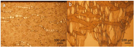 Figure 4 shows the structure of a stretched membrane. It can be seen that the pores were the place that cracks started to occur. Small cracks adjacent to each other converge into a long crack perpendicular to the loading. The thinning process usually started at the periphery of pores and regions with less or no pores decreased in size and became connected by mutiple thinned strips as shown in Figure 4b. This morphological observation indicates that when applying the membrane to a repair site, the wrapping process needs to be carefully handled with gentle stretching so that the enlargement of the pores on the membrane can be minimized.