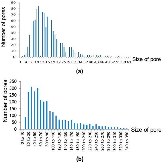 Pore size distribution of (a) membranes made from 100 µm powder (b) membranes made from 500 µm powder.