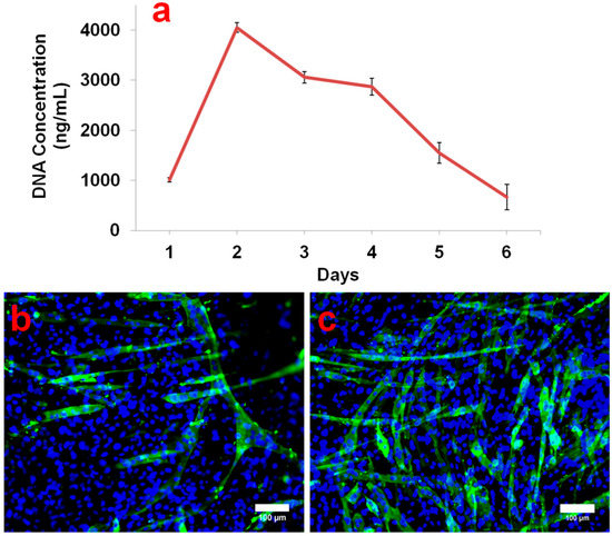 In order to investigate the cell proliferation rate, C2C12 myoblasts grown on biocompatible PCL membranes were subjected to a PicoGreen DNA quantification assay. Figure 6a shows the cell DNA concentration per PCL membrane at different time intervals. During the DNA quantification assay, the DNA concentration was found to be around 1000 ng/mL, 1 day after cell seeding. Remarkably, on day 2, there was a four-fold increase in the cell DNA concentration (4000 ng/mL). It has already been reported that the C2C12 doubling time is approximately 12 h [22,23]. Hence, the observed four-fold increase in DNA concentration after 24 h is feasible. On day 3, a sudden decline in DNA concentration was observed. Moreover, the DNA concentration gradually and continuously decreased till day 6 and finally it fell below 1000 ng/mL. The cell proliferation results showed that on day 2, C2C12 reached 100% confluence. This contact inhibition of C2C12 growth coupled with withdrawal from the proliferation cycle as myoblasts fused to form myotubes, causing a down-turn in cell population as seen from day 3 onwards. Nevertheless, the results from the first two days imply that the PCL membrane provides good support for cell attachment and proliferation.