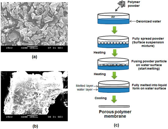 (a) SEM image of 100 µm dry PCL powder at ×200; (b) SEM image of 500 µm dry PCL powder at ×200; (c) Schematic illustration of a micro-porous membrane fabrication starting from a micro-particles powder layer forming a surface suspension mixture.
