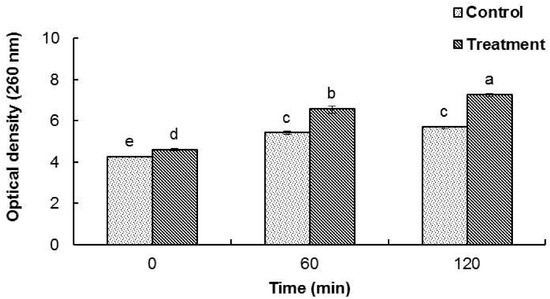 The integrity of the cell membrane of B. cereus (ATCC 13061) was determined by the degree of cellular materials, especially DNA and RNA, in the supernatant [32]. AEO at the MIC concentration was added to 2 mL of the bacterial inoculum (107 cfu/mL) in sterilized peptone water (0.1 g/100 mL) and then incubated at 37 °C. Bacterial samples were collected after 0, 60 and 120 min of incubation and centrifuged at 1372 g, after which the UV absorbance of the supernatant was measured at 260 nm using a spectrophotometer. Corrections for treated cultures were made by taking AEO without bacteria in sterilized peptone water. The untreated bacterial cultures were corrected with sterile peptone water.