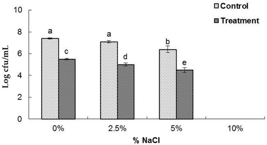 Effect of Enteromorpha linza essential oil (AEO) at MIC concentration on the reduction of salt tolerance of Bacillus cereus ATCC 13061. Data are expressed as the mean ± SD. Values with different superscript letters are significantly different at p < 0.05.