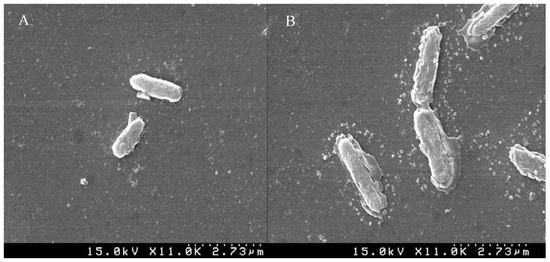 Scanning electron microscopy of Bacillus cereus ATCC 13061. (A): untreated B. cereus; (B): B. cereus treated with the essential oil from Enteromorpha linza.