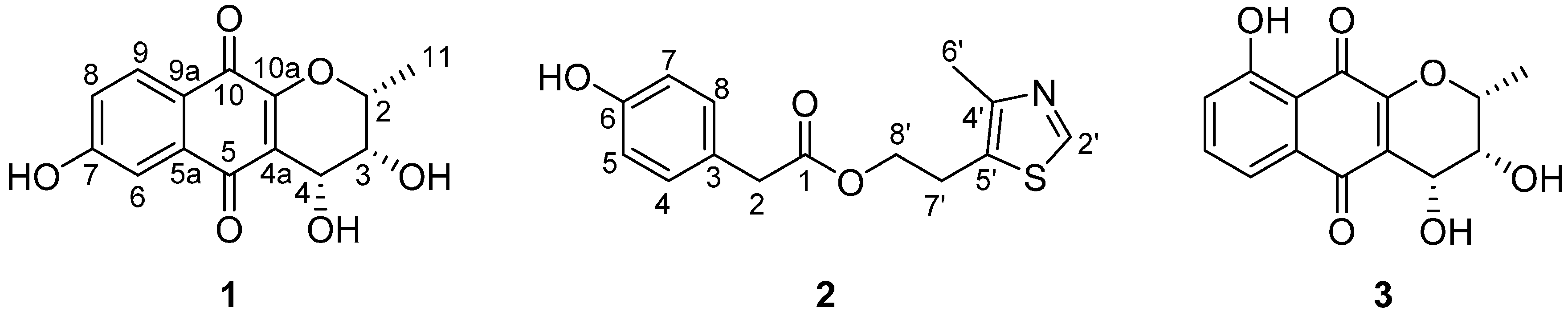 In summary, we have described herein the isolation and structural elucidation of a new 3,4-dihydro-2H-naphtho-[2,3-b]pyran-5,10-quinone and a new heterodimeric compound combining a hydroxyphenylacetate and a 4-methyl-5-thiazoleethanol substructure, which were isolated from the fermentation broth of Acaromyces ingoldii FS121. It merits attention that compounds 1 and 3 contained a 3,4-dihydro-2H-naphtho-[2,3-b]pyran-5,10-quinone core framework, which exhibited a wide range of biological activities [21]. The cell growth inhibitory effects of compounds 1–3 were evaluated, wherein compound 1 and 3 showed considerable activities against MCF-7, NCI-H460, SF-268 and HepG-2 tumor cell lines.