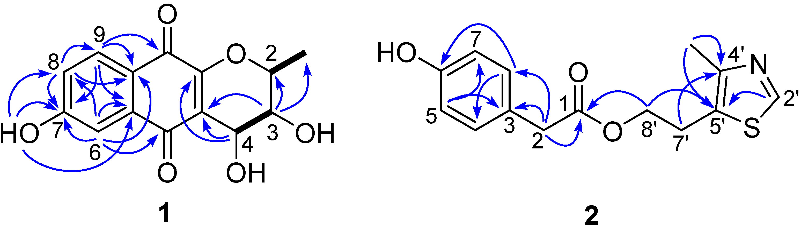 Compound 2 was obtained as a light pink oil. The HRESIMS (m/z 278.0845, [M + H]+, calcd. for C14H16NO3S, 278.0851) allowed the molecular formula C14H15NO3S to be assigned to 2, corresponding to eight degrees of unsaturation. The IR spectrum exhibited absorption bands for OH (3309 cm−1) and carboxyl groups (1732 and 1716 cm−1). The 1D NMR data of 2 (Table 1), in combination with the HSQC experiment revealed 14 carbon resonances, which showed representative signals for a 4-hydroxyphenylacetic acid moiety [δC 173.7, 157.6, 131.3, 126.1, 116.3, 41.2; δH 7.02 (2H, d, J = 8.6 Hz), 6.70 (2H, d, J = 8.6 Hz), 3.51 (s)]. This assumption was further confirmed by the HMBC correlations from H-2 to C-1, C-3 and C-8, H-5 to C-3 and C-7, and H-8 to C-6 and C-4. Besides, the 1H-NMR of 2 also exhibited a methyl signal at δH 2.24 (3H, s), two methylene protons at δH 3.02 (2H, t, J = 7.1 Hz) and 3.84 (2H, m), and an olefinic proton due to the thiazole ring at δH 8.61 (1H, s), suggesting the presence of a 4-methyl-5-thiazoleethanol substructure in 2, which has been reported in the literature [18]. Furthermore, the key COSY correlations of H-7′/H-8′ and HMBC correlations from H-2′ to C-4′ and C-5′, as well as Me-6′ to C-4′, and C-5′ also supported this deduce (Figure 2). Finally, the two substructures was connected by the HMBC correlations between H-8 to C-1 and C-5′. Thus, compound 2 was determined as depicted and given the trivial name as acaromyester A.