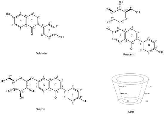 - Zhang, H.Y.; Feng, W.; Li, C.; Tan, T.W. Investigation of the Inclusions of Puerarin and Daidzin with β-Cyclodextrin by Molecular Dynamics Simulation. J. Phys. Chem. B 2010, 114, 4876–4883. [Google Scholar] [CrossRef] [PubMed]