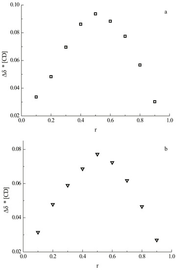 Job’s plot using the chemical shift of the H-5 signal of β-CD of (a) the complex of daidzein with β-CD; (b) the complex of daidzin with β-CD. “r” is the molar fraction of β-CD in the guest/β-CD mixture.