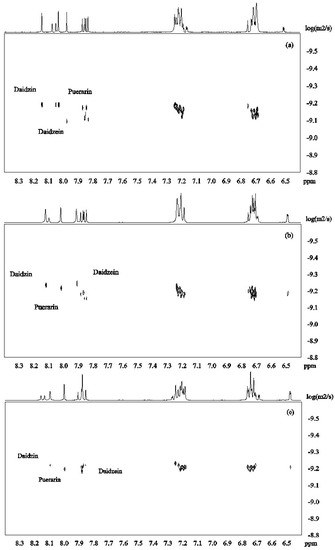 DOSY spectra for the mixture of isoflavones 1–3 alone and in the presence of β-CD were recorded at pH 12 in D2O (Figure 3). Figure 4a shows that the signals from daidzein were separated from those from the two other compounds due to faster diffusion caused by the smaller molecular mass. Puerarin and daidzin which have same molecular weight had similar apparent diffusion coefficients (Figure 4a). Diffusion coefficients are highly responsive to shape factors but even though puerarin is potentially more spherical than daidzin, similar diffusion rate were observed.