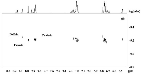 DOSY spectra of daidzein, daidzin and puerarin ((a): 2.0 mM for each); in the presence of β-CD ((b): β-CD 2.0 mM; (c): β-CD 4.0mM; (d): β-CD 6.0 mM in D2O, 30 °C).