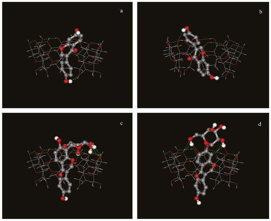 Possible structure of the inclusion complex between (a): daidzein and β-CD, type I; (b): daidzein and β-CD, type II; (c): puerarin and β-CD; (d): daidzin and β-CD obtained with the program Autodock 4.0).