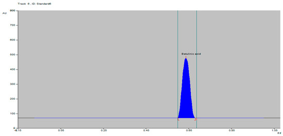 A solvent system consisting of toluene–ethyl acetate–glacial acetic acid (8.5:1.5:0.02 v/v/v) which provided a sharp and well-defined BA peak at an Rf value of 0.65 was selected (Figure 2). This solvent system for the isolation of BA has been reported herein for the first time. It was evident that the solvent system had a very good resolution for the separation of BA from the hexane extract of the Tecomella undulata bark (Figure 3).