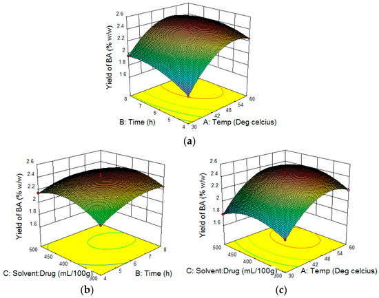 The square roots of A, B and C have negative effects on the response and among them A2 has more significant negative effect. This indicated that if temperature (A) were to be doubled then yield will be decreased strongly. The final combination ratio of the variables for the extraction was selected on the basis of yield of BA using three-dimensional response surface plots. Temperature (variable A) had a more significant effect on the yield of BA. As shown in Figure 5a,c, yield of BA was increased positively with extraction temperature up to 54.21 °C. However, the yield of BA decreased when the temperature was increased beyond 54.21 °C when solvent to drug ratio was fixed at 400 mL and time was set at 6 h. The maximum yield of BA was obtained at an optimum temperature of 54 °C, proving that a higher temperature is helpful in enhancing the compound yield as it increases the diffusion coefficient and solubility, although it may also cause compound degradation [27]. Figure 5b with the temperature set as 45 °C, showed an increased BA yield at longer time (variable B) and lower solvent to drug ratio (variable C). For BA yield, the optimum time was 6.38 h and the solvent to drug ratio was 369.25 mL/100 g.