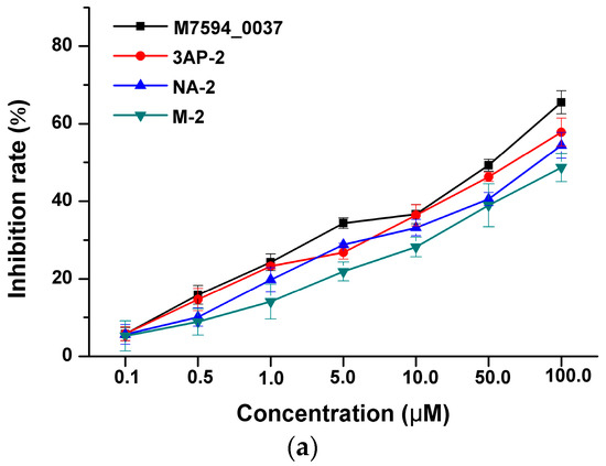 Inhibition rate of M7594_0037 and analogs against A549 (a); MCF7 (b) and HeLa (c) in dose-dependence.