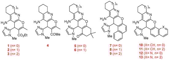 The synthesis of racemic imidazopyranotacrines 1–13 has been carried out by Friedländer-type reactions [26], by treating readily available 4H-pyrans with commercial cycloalkanones, under standard reaction conditions, and in good chemical yields. Cyclopentanone, cyclohexanone and cycloheptanone were chosen in order to evaluate the effect of the size of the cycloalkyl ring on the biological activity of the new pyranotacrines (Scheme 1). Starting from 1-methyl-1H-imidazole-2-carbaldehyde (14), we synthesized 2-(1-methyl-1H-imidazol-2yl)methylene)malononitrile (15), whose reaction with the appropriate 1,3-dicarbonylic compound or naphthol derivative, gave the key 4H-pyrans. For the synthesis of pyranotacrines 1–3, we have used ethyl acetoacetate as starting material, thus leading to imidazopyranotacrines bearing a methyl and ethoxycarbonyl substituents at C-2 and C-3, respectively. Similarly, for the synthesis of the pyranotacrines 4 and 5 or 6, we used 2,4-pentandione, and 5,5-dimethylcyclohexane-1,3-dione, respectively. Finally, for the synthesis of the remaining pyrano-tacrines 19–21 we have prepared some conveniently key functionalized 4H-pyrans from 1-naphthol, 2-naphthol, and 8-hydroxyquinoline. All new compounds showed excellent analytical and spectroscopic data, in good agreement with their structures.