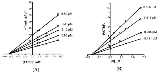 (A) Lineweaver-Burk plot and (B) Cornish-Bowden plot both illustrating non-competitive inhibition of EeAChE by compound 8. The intersection point in Cornish-Bowden plot gives an estimate of the inhibition constant. Lines were derived from a weighted least-squares analysis of data. ATCh = acetylthiocholine (substrate).