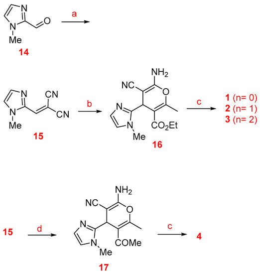 To a solution of the 2-(1-methyl-1H-imidazol-2-yl)methylene)malononitrile (15) in ethanol (1 mmol/10 mL), the corresponding 1,3-dicarbonyle (1.1 mmol), and some drops of piperidine were added. The mixture was stirred at room temperature (rt) and the reaction was monitored by TLC. The precipitated solid was isolated by filtration, washed with cold ethanol, and purified by silica gel flash chromatography using AcOEt/Hexane (1:1) as eluent to give pure compounds.