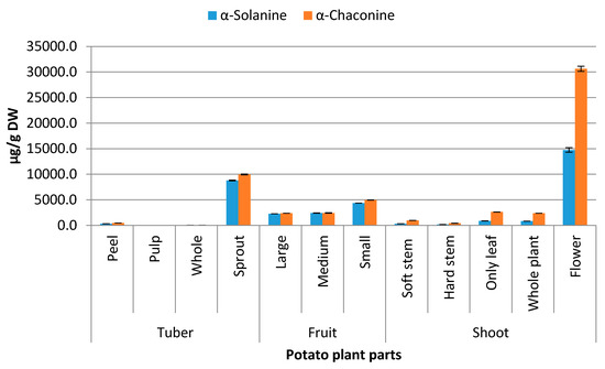 - Friedman, M.; Dao, L. Distribution of glycoalkaloids in potato plants and commercial potato products. J. Agric. Food Chem. 1992, 40, 419–423. [Google Scholar] [CrossRef]