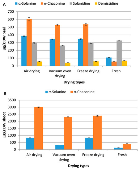 Hossain, M.B.; Brunton, N.P.; Rai, D.K. Effect of Drying Methods on the Steroidal Alkaloid Content of Potato Peels, Shoots and Berries. Molecules 2016, 21, 403. https://doi.org/10.3390/molecules21040403