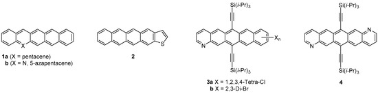 The polycenes, represented by pentacene (1a) have long been of interest in the area of semiconductors with potential applications in organic thin-film transistors (OTHFTs) [1,2,3], and organic light-emitting diodes [4]. In order to overcome the major drawbacks of pentacene such as its insolubility at room temperature and rapid degradation [5], continuous efforts have been pursued to prepare soluble precursors that can be thermally converted to pentacene [6], the introduction of substituent(s) on the basic skeleton [7,8,9], and substitution of the benzene moiety by isosteric aromatics such as thiophene (compound 2) [10], and pyridine (compounds 3 [11] and 4 ([12]) (Figure 1).