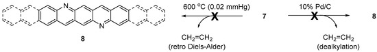Catalytic dehydrogenation and/or dealkylation [23,24,25,26] and vacuum pyrolysis [27,28,29,30,31] of cyclohexenes have been commonly employed to build up benzene rings, in which the former proceeds via elimination of alkyl substituent(s) and the latter via retro-Diels-Alder reaction. However, all attempts, including catalytic dehydrogenation (10% Pd/C in nitrobenzene at 200 °C for 8 h) and vacuum pyrolysis (0.02 mmHg, 600 °C, 45–60 min) of the compounds 7 leading to the corresponding diazapolycenes 8 have been as yet unsuccessful (Scheme 2). It should be noted that vacuum pyrolysis of 7a,b resulted in sublimation of the compounds which remain unchanged, while 7c decomposed.