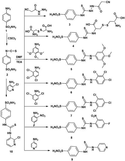 The aim of this work was to design and synthesize a novel series of thioureido-sulfonamide derivatives and examine their potential anticancer activity starting with the reported isothiocyanatobenzenesulfonamide 2 which was prepared by the reaction of sulfanilamide with thiophosgene following a reported method [18].