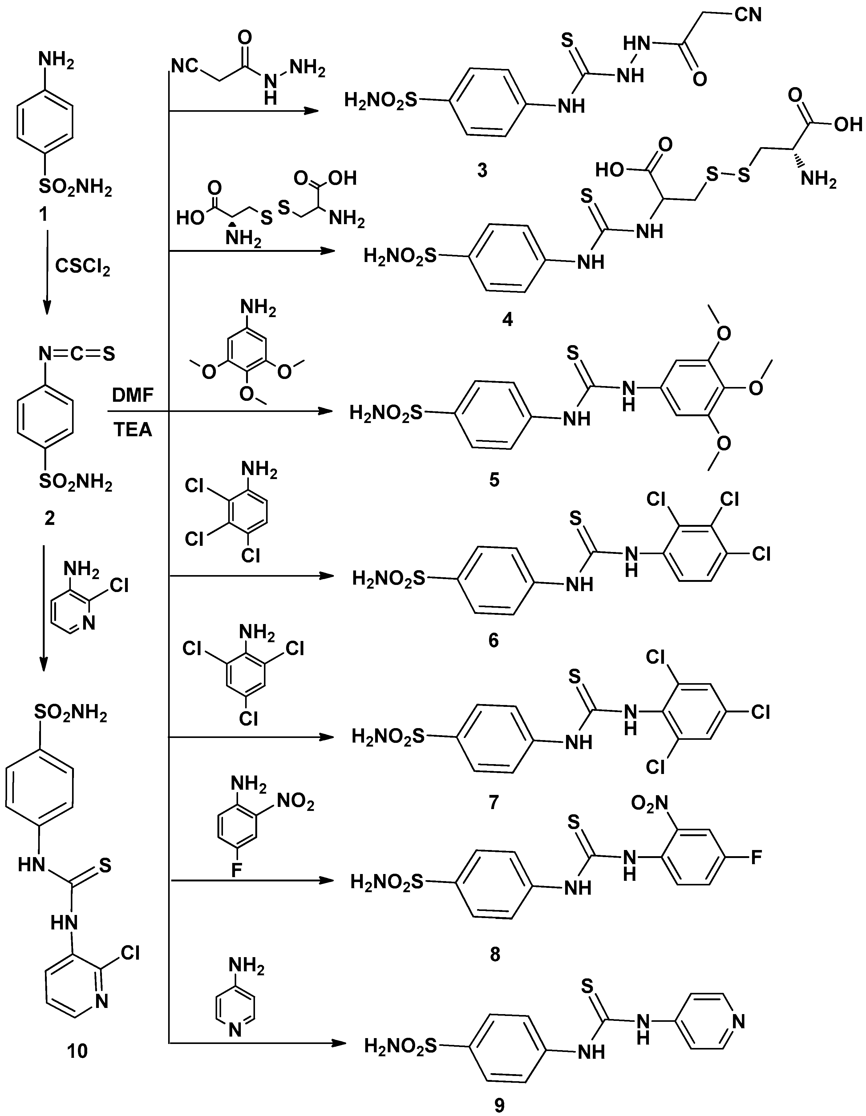 Cancer and carcinogenesis are complicated and multifactor processes that results in several biochemical alterations in a single cell. All diseases can most likely be attributed to multifactorial effects, and these factors may interact with each other, hence inducing biological changes in a single cell over a period of time. The interaction of the multifactorial effects aggravates the cancer. To solve the extraordinary complexity of cancer and provide excellent therapeutic drugs, several researchers have focused their work on discovering new multitarget drugs which are able to interact with multiple altered pathways [1,2]. In the efforts to find new drugs with these capabilities, scientists have focused on many different characteristics of cancer biology during their research. Among the anticancer drugs discovered recently, various sulfonamides possess potent anticancer properties [3,4] which is attributed to their ability to inhibit carbonic anhydrase enzymes [5]. Carbonic anhydrases is a family of Zn-based metalloenzymes that catalyze the interconversion between carbon dioxide and bicarbonate with generation of protons. The carbonic anhydrase isozyme IX (CA IX) is reported to be associated with tumorigenesis being highly expressed in hypoxic tumors with limited expression in normal tissues [6]. Thiourea derivatives represent one of the most promising classes of anticancer agents with a wide range of activities against various leukemia and solid tumors [7,8,9]. In previous work, combinations of sulfonamide and thiourea derivatives have produced promising anticancer agents [10,11,12]. The importance of this paper lies in that the next generation sulfonamide-thiourea derivatives might be more efficacious as anticancer agents. Since one of the common methods for drug design in medicinal chemistry is varying substituents, we report herein the synthesis and in vitro anticancer evaluation of a novel series of thioureido-sulfonamide derivatives as a continuation of our ongoing research project concerned with the synthesis of novel heterocyclic compounds as anticancer agents, where we have identified novel classes of pyrrole, pyrrolopyrimidine, 4-aminopyridine, quinolines and sulfonamides and these new derivatives showed significant anticancer activity on different biological targets and human cancer cell lines [13,14,15,16,17].