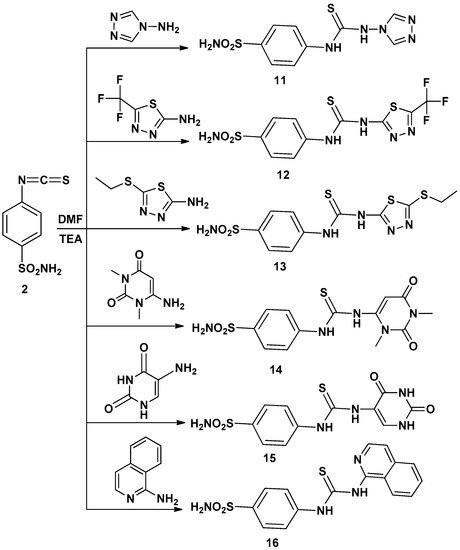 Thus, interaction of compound 2 with several amines in dry DMF containing triethylamine as catalyst afforded the corresponding sulfonamide derivatives 3–16 (Scheme 1 and Scheme 2) according to the reported methods [11,12,19]. The structures of the obtained compounds were established on the basis of elemental analyses and spectral data. The IR spectra of compounds 3–16 showed the absence of N=C=S groups and presence of absorption bands for (NH), (CH arom.), (CH aliph.), (C=S) and (SO2).