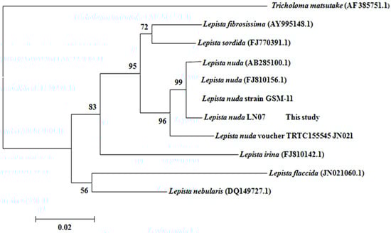Based on the morphological properties of its fruiting body, strain LN07 was initially determined as basidiomycete fungus Lepista nuda. After that, a 632-bp fragment of ITS region was amplified and sequenced, and then compared in GenBank using BLAST. The results revealed that strain LN07 was closest to Lepista nuda (AB285100.1), Lepista nuda (FJ810156.1) and Lepista nuda strain GSM-11 with a sequence homology of 99%. A phylogenetic tree on account of ITS region of Tricholomataceae species was constructed, from which we could also see that the strains most closely related to strain LN07 were all Lepista nuda (Figure 1). Therefore, strain LN07 was identified as Lepista nuda not only from the fruiting body morphology but also from the ITS sequence [19].