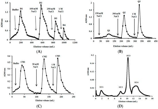 (A) Ion exchange chromatography on a DEAE-cellulose column. Sample: Proteins derived from fermentation broth of Lepista nuda. Laccase activity resided in fraction D3; (B) Ion exchange chromatography on Q-Sepharose column. Sample: Fraction D3 derived from DEAE-cellulose. Laccase activity resided in fraction Q2; (C) Ion exchange chromatography on CM-cellulose column. Sample: Fraction Q2 derived from Q-Sepharose. Laccase activity resided in fraction CM2; (D) Gel filtration by fast protein liquid chromatography on a Superdex 75 HR 10/30 column using an AKTA Purifier System. Sample: fracton CM2. Flow rate: 0.5 mL per minute. Laccase activity was enriched in fraction SU3.