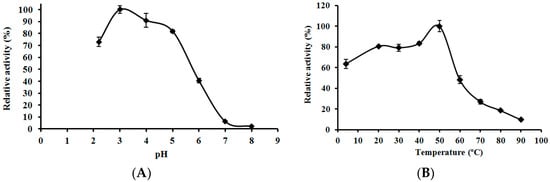 (A) Effect of pH on laccase activity of Lepista nuda laccase. Results represent mean ± SD (n = 3). (B) Effect of temperature on laccase activity of Lepista nuda laccase. Results represent mean ± SD (n = 3).