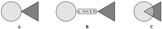 General integration modes of active dual structures. (A) Direct no-linker mode (fused hybrids); (B) Intermediate linker mode; (C) Overlap mode (merged hybrids).