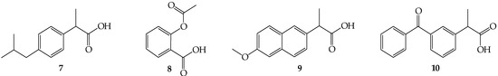 The triterpene compounds mentioned above (1, 2, 5, 6) are useful starting reagents in the synthesis of oleanolic acid skeleton-NSAID hybrid derivatives. Racemic compounds, such as ibuprofen (7), aspirin (8), naproxen (9), and ketoprofen (10) were applied as non-steroidal anti-inflammatory particles (Figure 2).