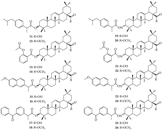 Inspired by the latest literature reports [4,5,6] as a key modulator of the activity of other biologically-active compounds (NSAIDs), we decided to use the broadly advantageous structure of naturally-occurring 3β-hydroxyolean-12-en-28-oic acid, commonly known as oleanolic acid (1). From a chemical point of view, it belongs to pentacyclic triterpene from the β-amyrine group with five six-membered cycles in the molecule, which offers great powers both as a bioactive molecule and as a carrier for other external activities. In nature, this compound exists either as a free acid or as a component of triterpenoid saponins, in which it can be linked with one or more sugar chains. This natural triterpene, widely distributed in plants, has shown several relevant biological activities including the modulation of the immune inflammatory response [7]. Oleanolic acid and its derivatives possess several promising pharmacological activities, such as hepatoprotective and anti-inflammatory, antiviral, antibacterial, fungicidal, antioxidant, or anticancer [8]. Therefore, terpenes containing the hydroxyl or hydroxyimino reactive groups can be used to prepare derivatives with the commercial anti-inflammatory drugs with a carboxylic function, leading to new dual compounds. Recently, its semi-synthetic acyloxyimino derivatives with analgesic and anti-inflammatory effects were also reported [9,10]. In the last decade NSAID drugs have been extensively investigated for anticancer and chemopreventive activity against various types of cancers [11,12]. They appear to act via depression of prostaglandin synthesis through inhibiting cyclooxygenase-2, which results in suppression of proliferation, possibly throught enhancement of apoptosis [13]. However, NSAID drugs are known for their side effects on the gastrointestinal system, particulary stomach ulceration, bleeding, perforation, and action exerted by contact of drug with gastric mucosa [14]. Inflammation is not direct, but very often the initial, trigger of several different diseases, it is supposed that fusing the anti-inflammatory drugs and the oleanane active structure, resulting in combined compounds, showed an enhanced biological effect with synergistic action and minimized toxicity or adverse reactions.