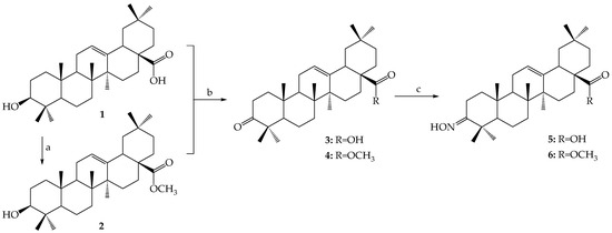 First, oleanolic acid (1) was methylated with dimethyl sulfate in an ethanolic solution of NaOH and methyl oleanolate (2) was obtained with a high yield [19]. Next, oleanolic acid and its methyl ester were oxidized with Jones reagent in acetone at room temperature [16]. The 3-oxoderivatives obtained (3, 4) were subjected to a reaction with hydroxylamine hydrochloride in ethanol, in accordance with the procedure known for many different oxotriterpenoids. Heating oleanolic ketones (3, 4) with hydroxylamine hydrochloride produces the corresponding oleanolate oximes (5, 6) [17]. The spectral data of all the starting compounds (2–6) were confirmed the data from the literature [16,17,19,20].