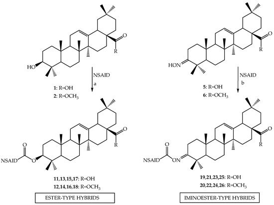 The main chemical directions of oleanolic acid-NSAID compounds synthesis. Reagents and condition: (a) ester-type hybrids: DCC, DMAP, anhyd. CHCl3, RT; and (b) iminoester-type hybrid: DCC, anhyd. CHCl3, RT.