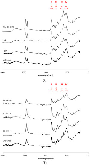 ATR-FTIR spectra of extractive—free untreated and pretreated solid fractions from (a) hydrothermal and steam explosion pretreatments and (b) treatments with organic solvents. The following regions marked correspond to: (I) region 1740–1715 cm−1 that accounts for the ester groups (C=O stretch); (II) “lignin triplet” region, including the three characteristic bands at 1600–1400 cm−1, derived from C=C vibrations of the aromatic ring, (III) region 1265–1161 cm−1 for symmetric and asymmetric C–O–C stretching and (IV) region 1092–1034 cm−1 that accounts for C–H, C–O and –OH deformations.