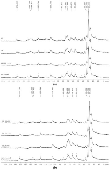 The NMR spectra of pretreated residual solids (Figure 2) show that both main aliphatic bands generally decrease. In SE and OS/EtOH 10:90 and OS/EtOH 50:50, the two bands are affected in a similar way, but when higher ethanol concentration is used, the decrease at 30 ppm is slightly more significant than that at 33 ppm. When NaOH is added, the opposite effect is observed, thus confirming the preferential removal of methylenes at 33 ppm compared to those at 30 ppm. Reasonance from 33 ppm carbons disappears completely, while the band at 30 ppm has been decreased significantly. Strong intensity of 72–74 ppm bands is obvious in sample treated with alkaline catalyst. Reasonances from epoxy rings and methoxy groups are less intense in SE sample, but are not affected in the other spectra. Band at 104 ppm appear slightly increased in HT sample, but reduce when organic solvent is used in the liquid mixture; interestingly, a remarkable increase of this band is observed in spectrum of OS/NaOH sample. The band at 130 ppm appears in lower absorbance in all OS samples, especially when alkaline catalyst is used. Resonances from ester and carboxylic acid groups in 172 ppm remain unaltered in all samples, apart from those after HT and OS/NaOH treatment, indicating that part of these components is affected by pretreatment.