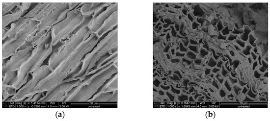 SEM images of (a) radial and (b) cross section of untreated birch outer bark. Magnification 1000×.